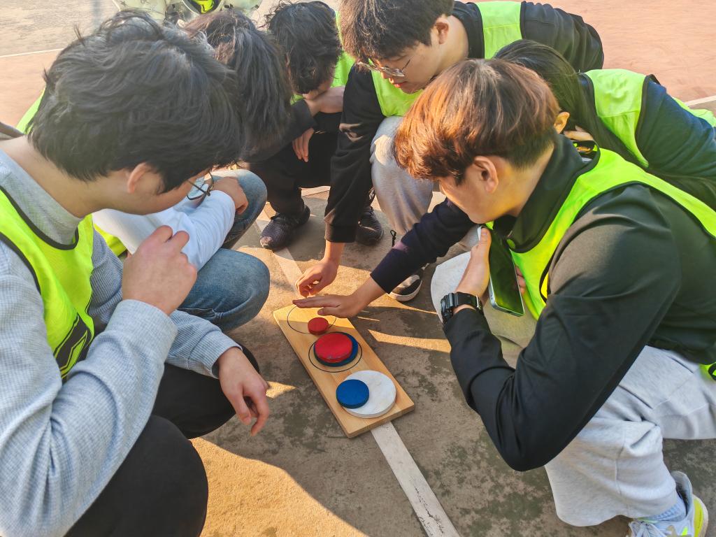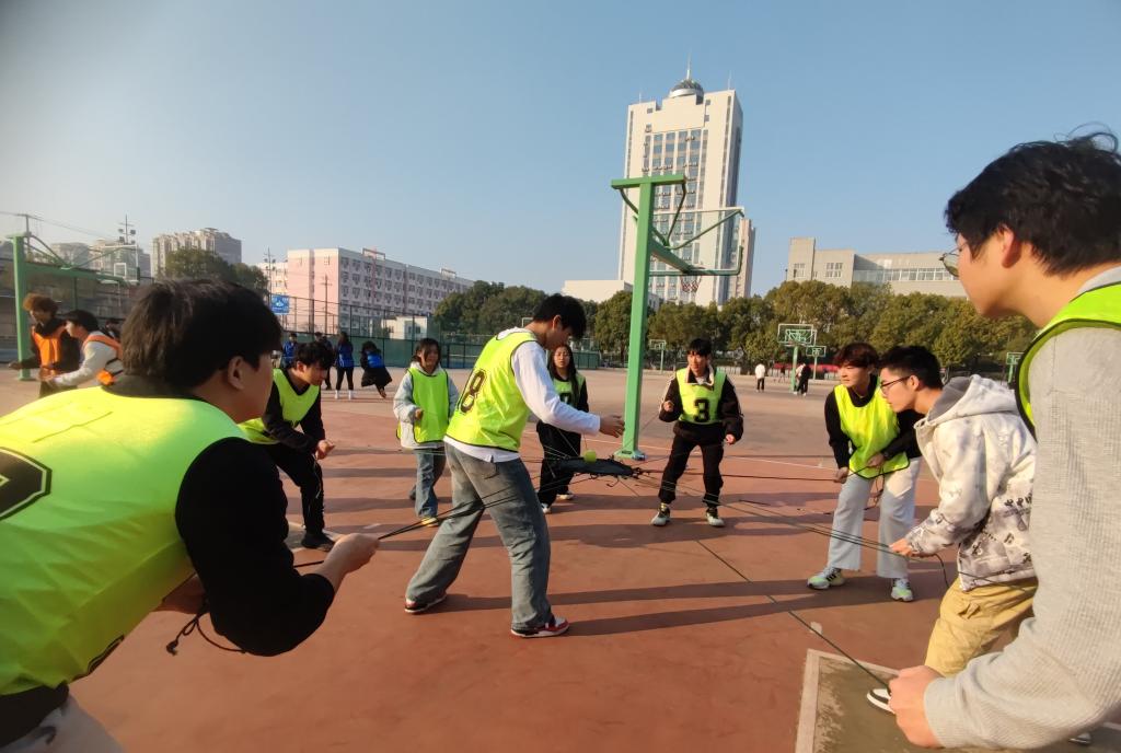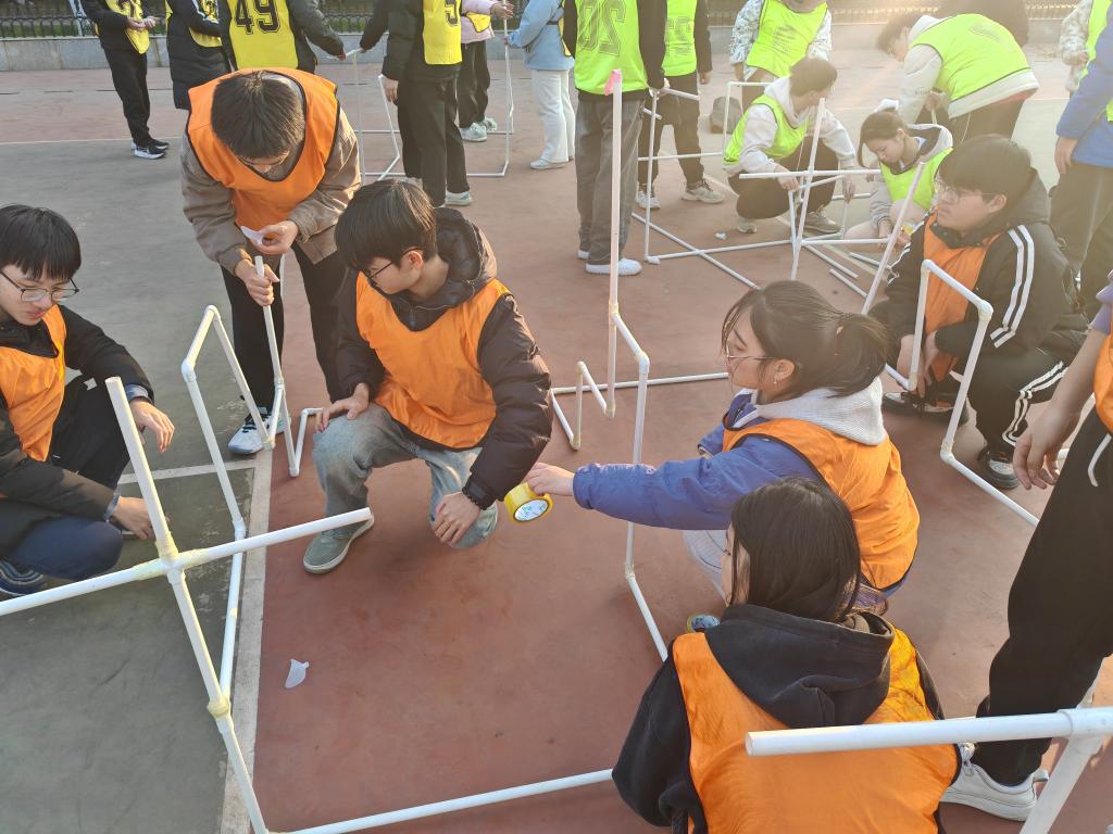在拉鼓绳颠动鼓上网球的“鼓动人心”、用“接力棒”运球绕柱接力的“神柱运球”,自下而上从大到小地圆盘移动的“汉罗塔”,看图搭建呼吸机集体吹爆气球的“呼吸的力量”、绳子绕圈旋转绳上行走的“动力圈绳”等趣味活动中,同学们分工协作,琢磨尝试、同频共振,齐心协力,全情参与感受团队的力量和成功的喜悦。