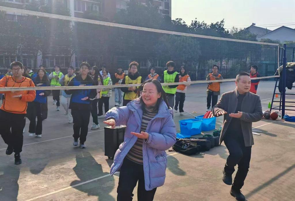 “拖拉机”暖场舞拉开活动序幕。在素拓教练的示范下,老师和同学们踏着欢快的节奏,侧身左腿屈膝左手扶拖拉机右手空摇把手启动,随后原地跑动开启作业模式,插秧、脱粒,一番劳作收获欢乐景象。