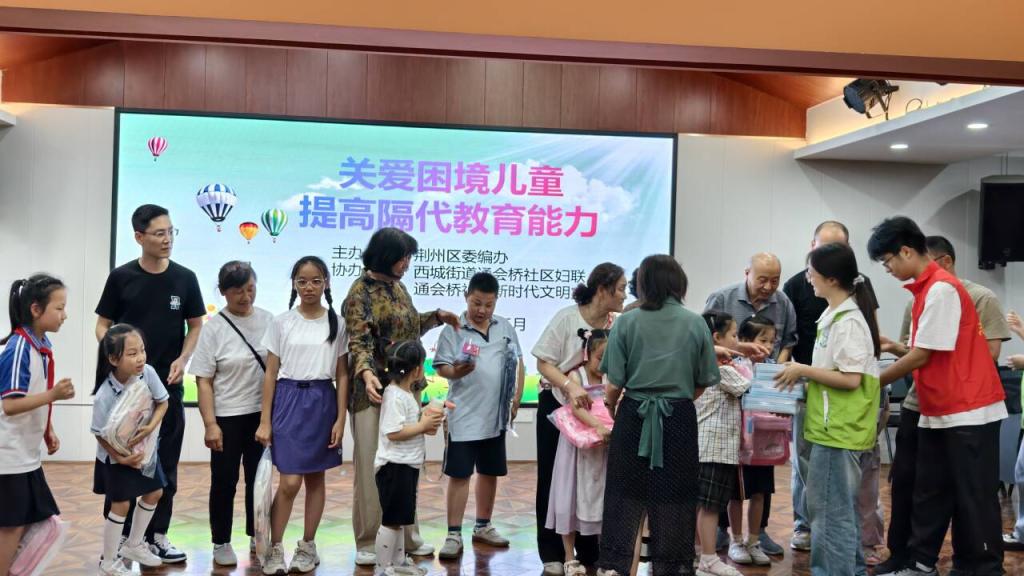 活动尾声,志愿者协助荆州区委编办、通会桥社区领导为困境儿童送上了精心准备的书包、文具等实用学习用品,鼓励孩子们勤奋学习。孩子们手捧礼物展露笑容,现场拍摄的合影记录下温馨瞬间。