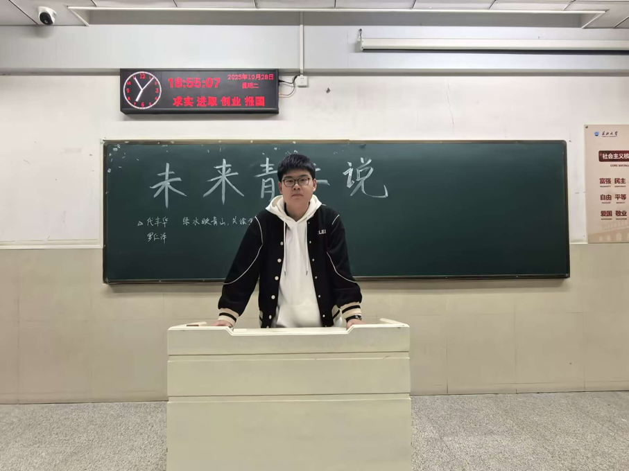 演讲的过程中,他说道:“保护生态不是遥不可及的大目标,而是我们随手能做的小事:拧紧没关严的水龙头,把垃圾扔进分类箱,看见路边的小草不随意踩踏。作为未来的青年,生态梦不是别人的事,是你我一起动手筑的——你护一棵草,我守一滴水,慢慢就聚成了满目的青山绿水,圆了咱们共同的生态梦。”
